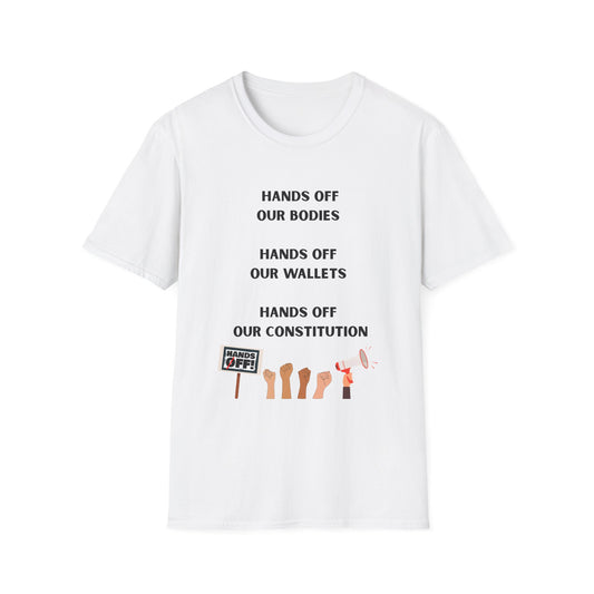 Unisex Softstyle Protest T-Shirt - "Hands Off Our Bodies, Wallets, and Constitution"