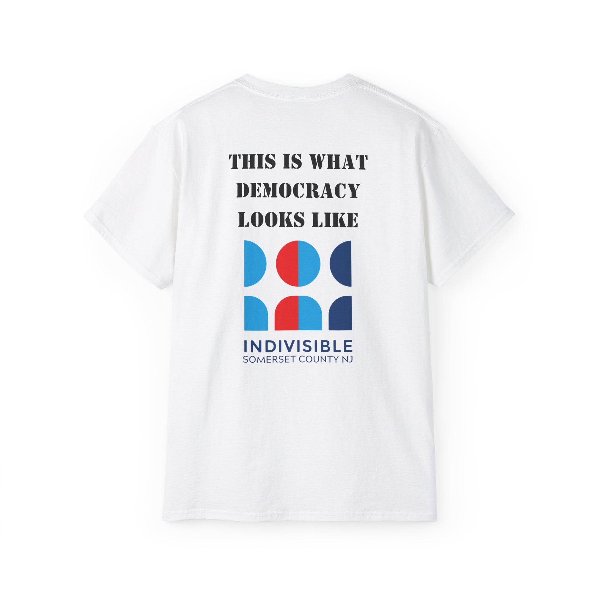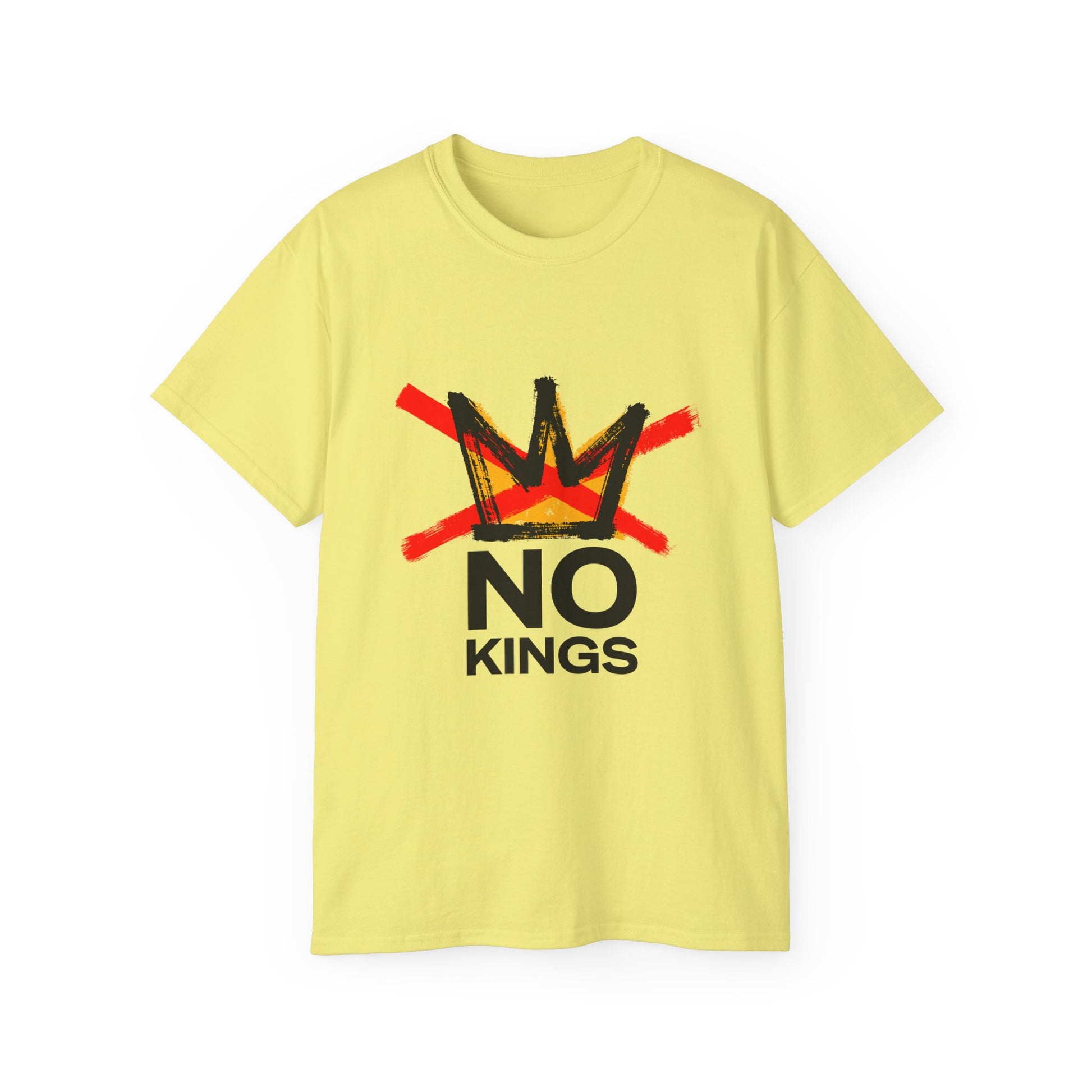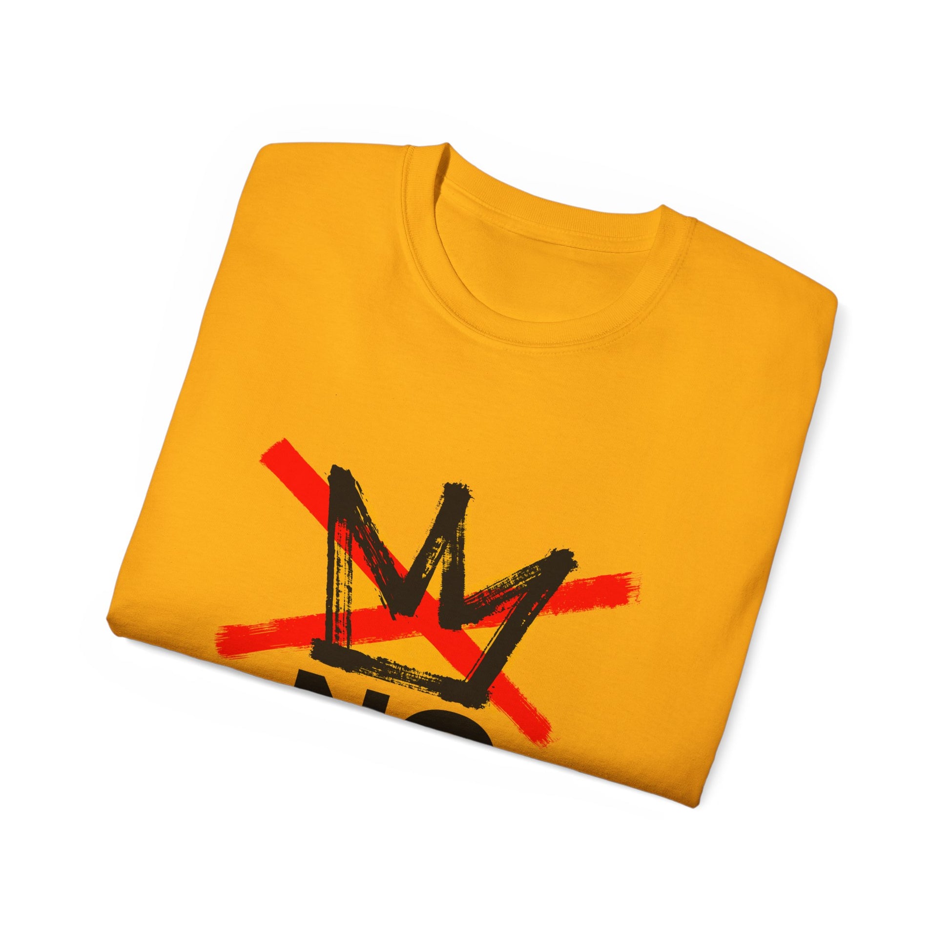 A unisex cotton tee perfect for No Kings or any other protests. Show the world that the United States is a democracy that does not and never will have a king with a shirt that's comfortable in every season.